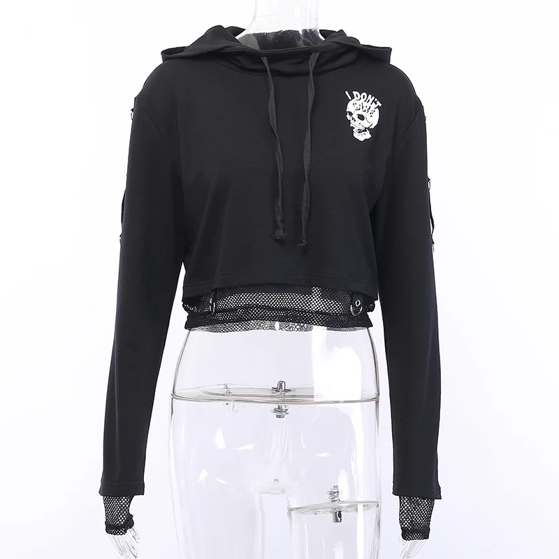 Best Gothic Black Women Long Sleeve Double-sided Letter Skull Print Splice Mesh Hollow Out Hooded Tops Goth Punk Dark Loose Hoodeis.