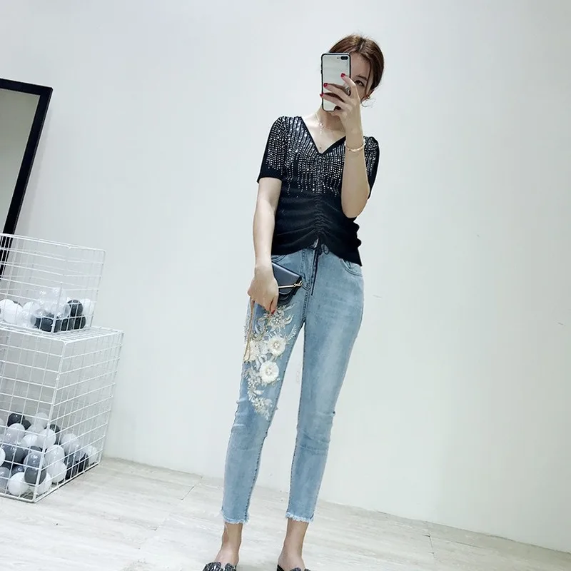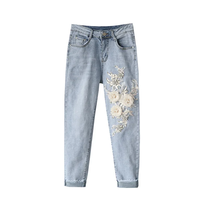 Best Slim versatile jeans woman literary women jeans fresh three-dimensional flowers ladies jeans beaded diamonds washed jeans women.